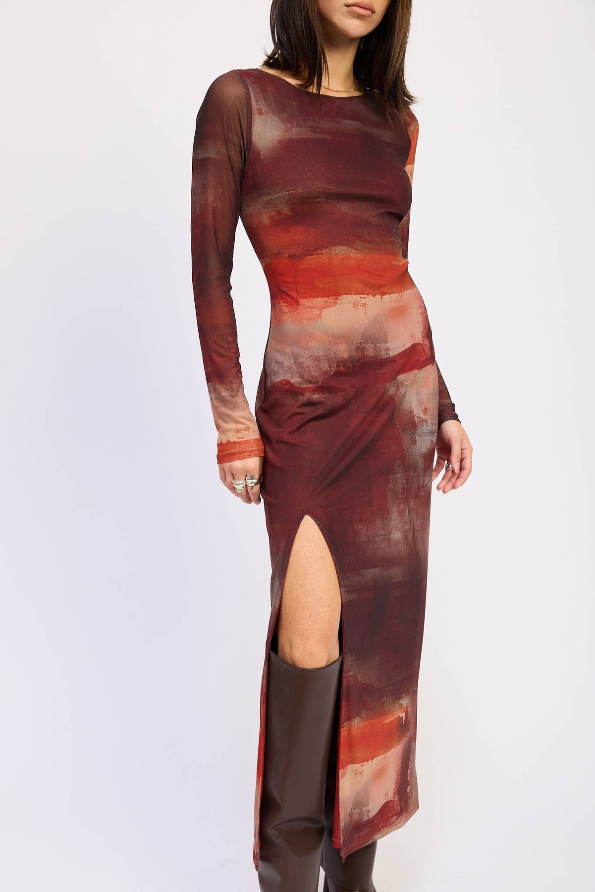 Fitting: True to Size Model wearing size S Length: Maxi Neckline: High Sleeves: Long Pattern: Abstract Fabric: Mesh Detail: High Slit