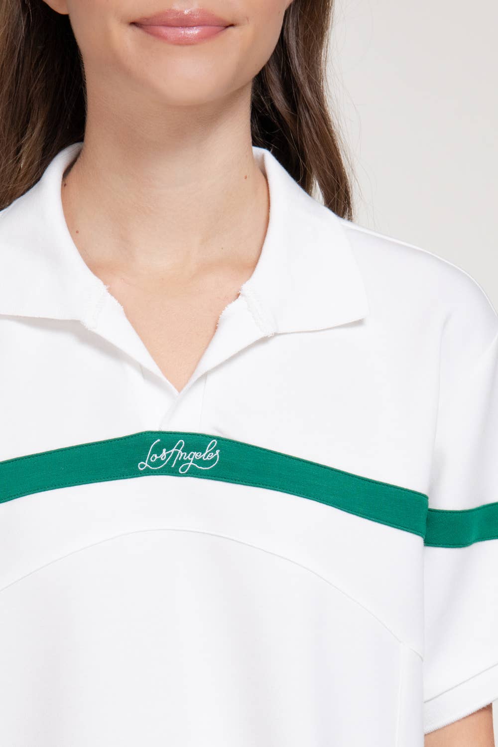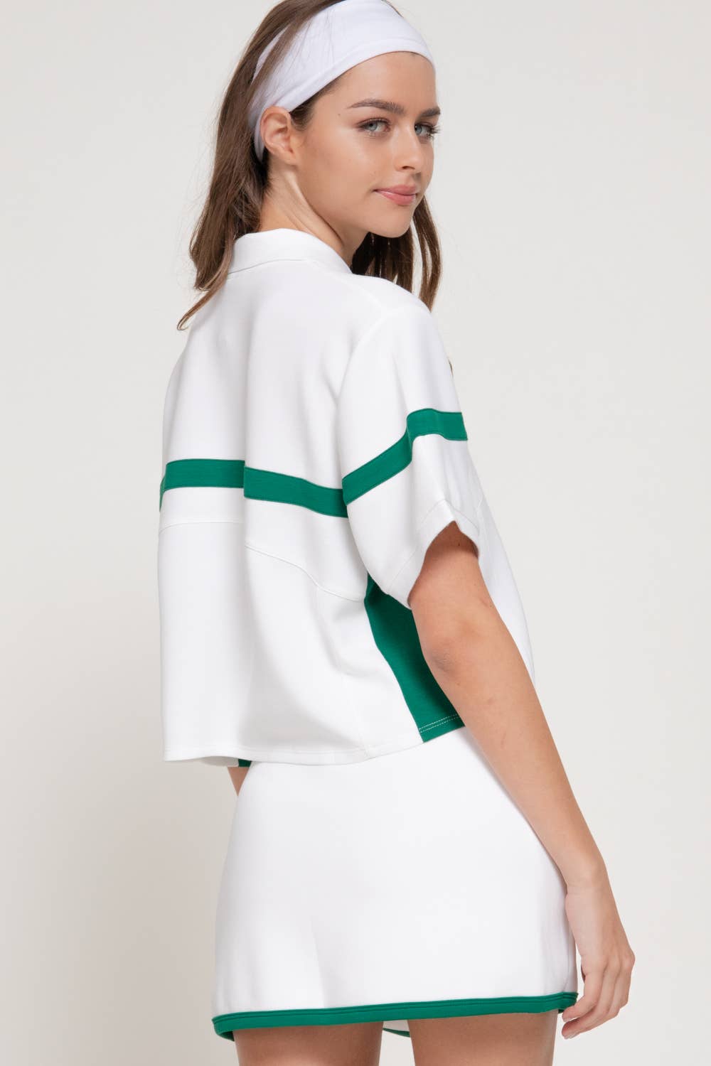 Fitting: True to Size Model wearing size S Silhouette: Box Length: Semi-Cropped Neckline: V-Neck Sleeves: Short Fabric: Soft Modal Scuba Pattern: Contrasting Colors Fabric: Soft Scuba Material: 51% Modal, 43% Polyester, 6% Spandex *Matching Skirt Sold Separately*
