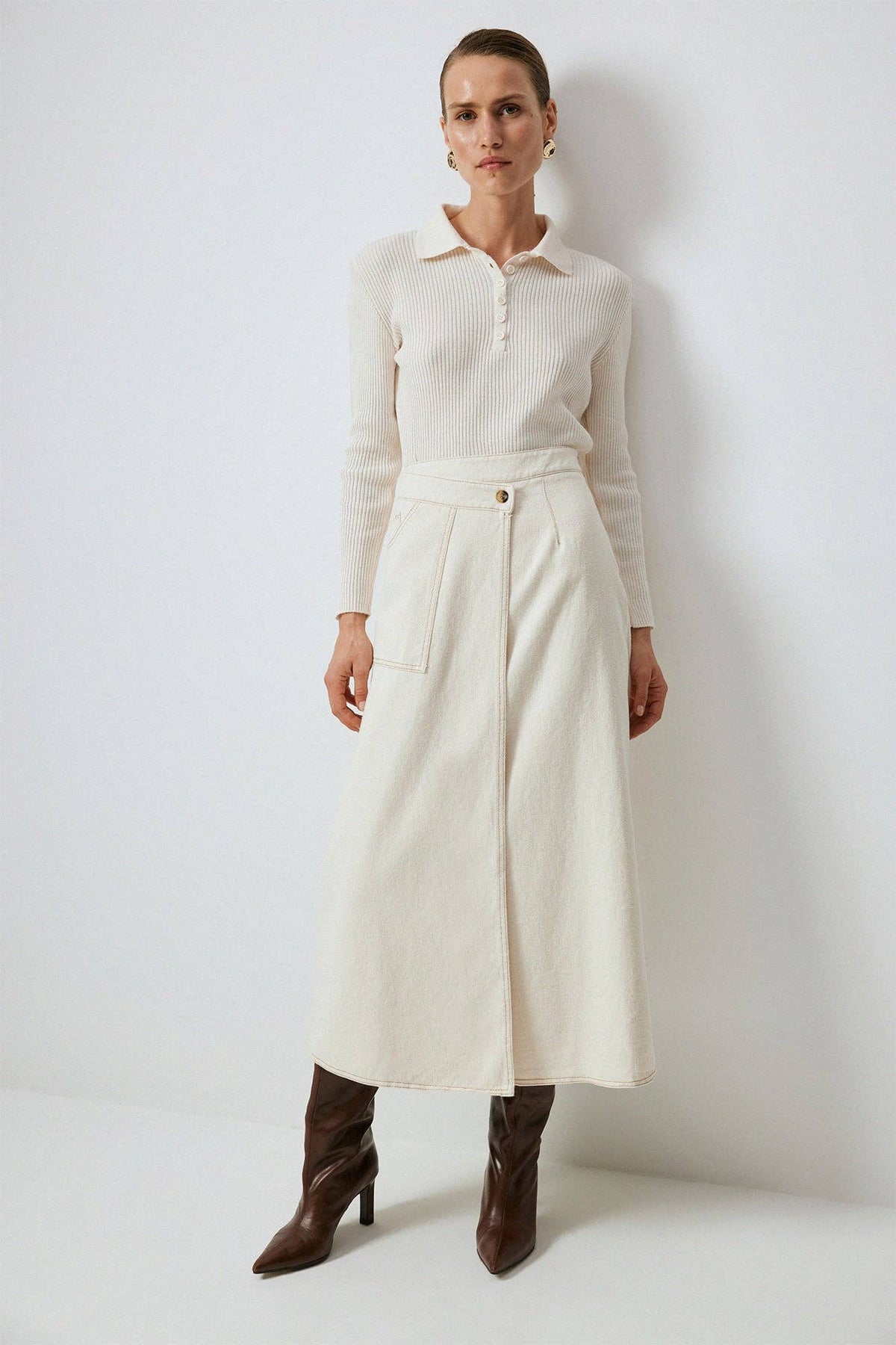 Fitting: True to Size Model wearing size S (34) Length: Maxi Waist: High Front Panel: Asymmetrical Silhouette: A-Line Pockets: Side Hemline: Clean, Minimalist Stitching