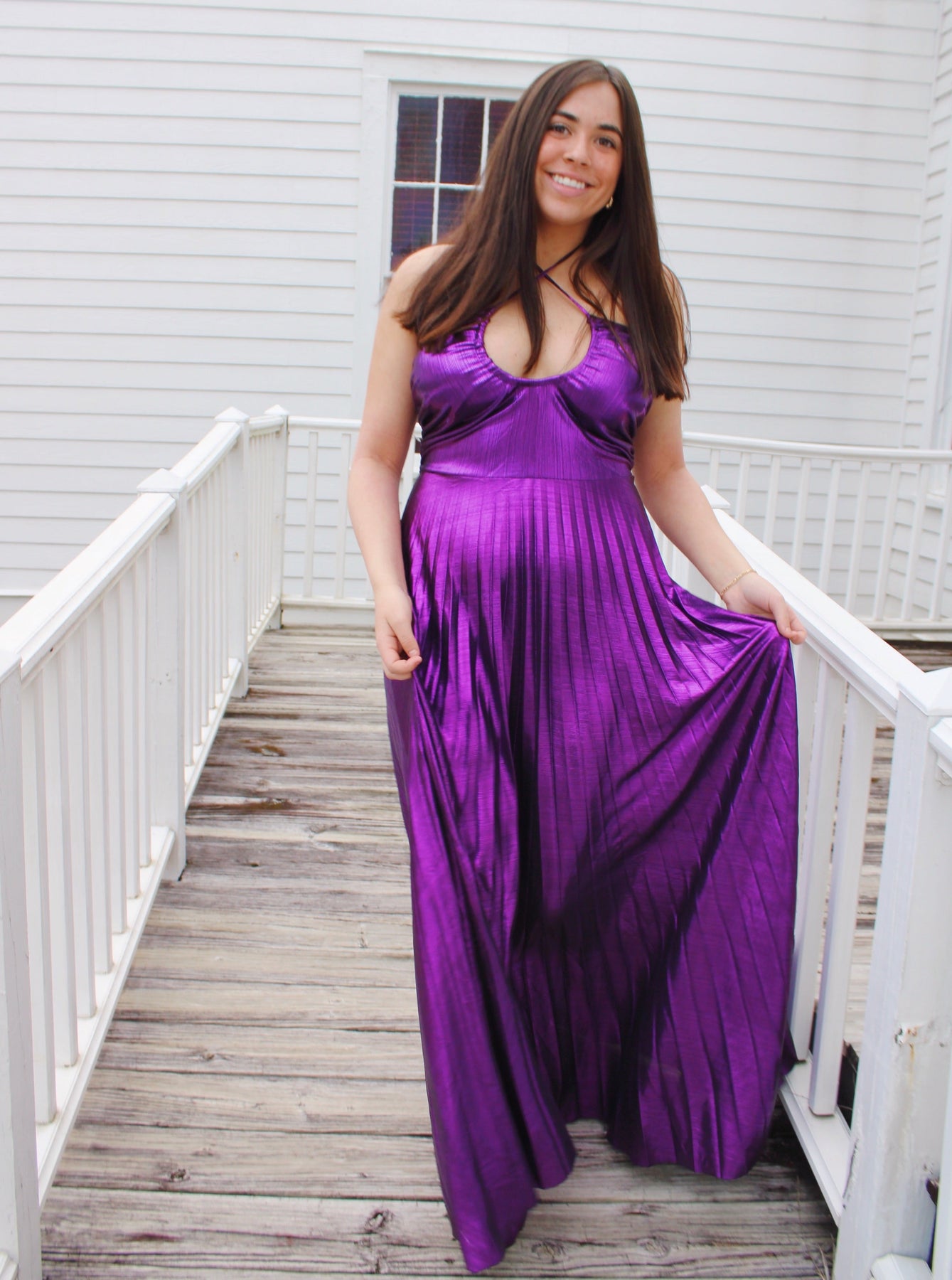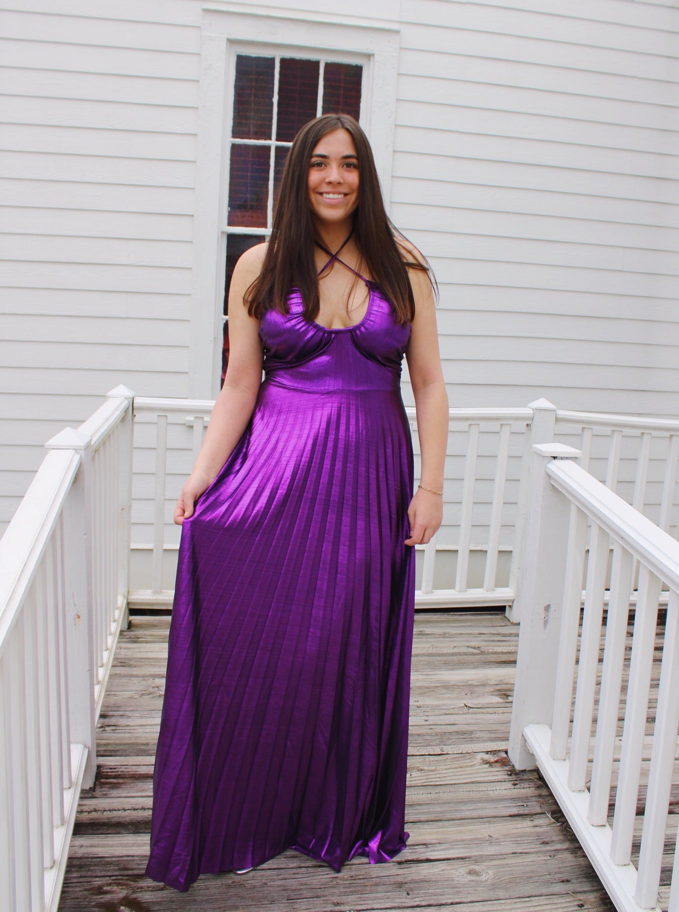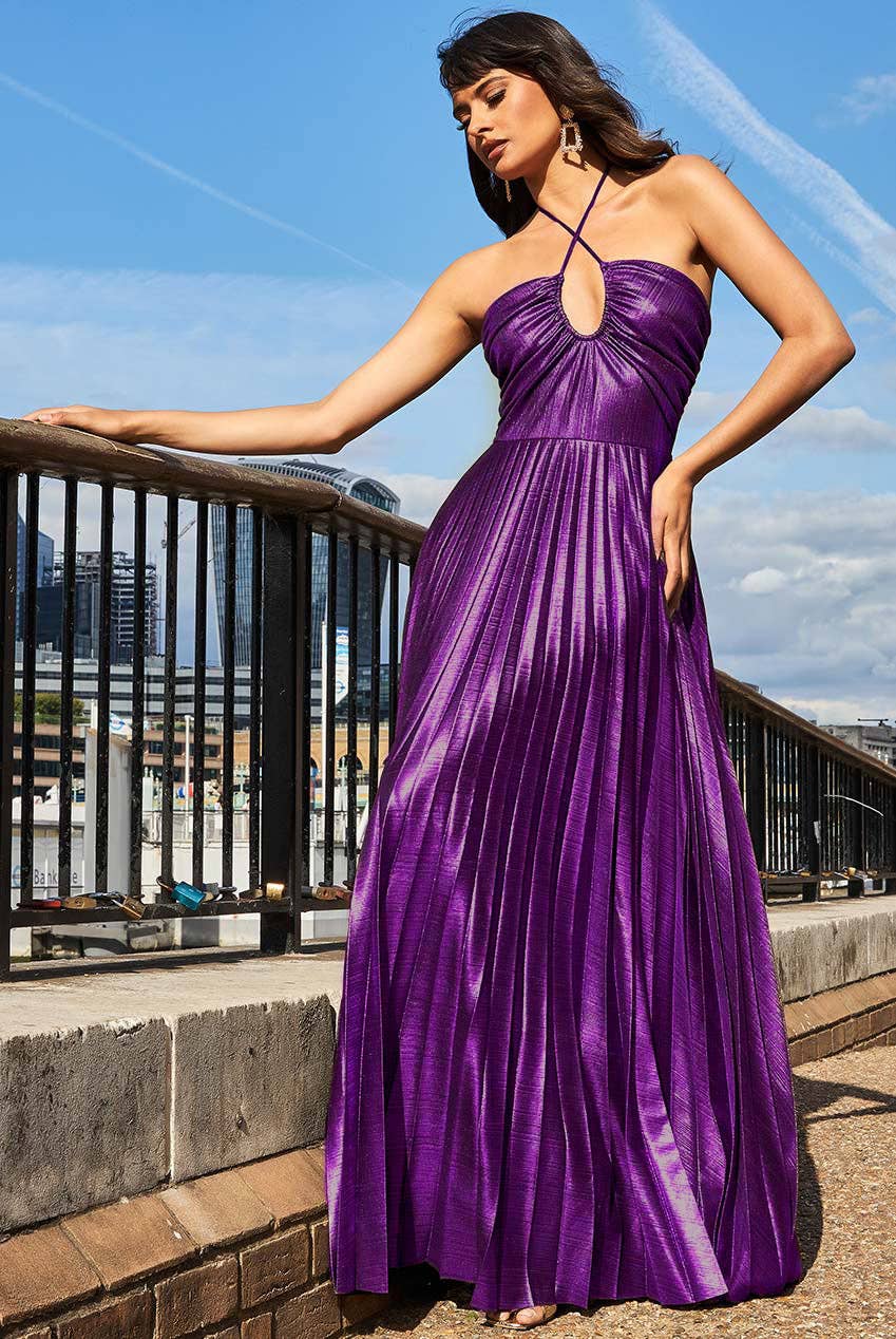 Fitting: True to SizeLength: MaxiNeckline: Criss-Cross HalterSleeves: SleevelessSilhouette: PleatedFabric: Metallic